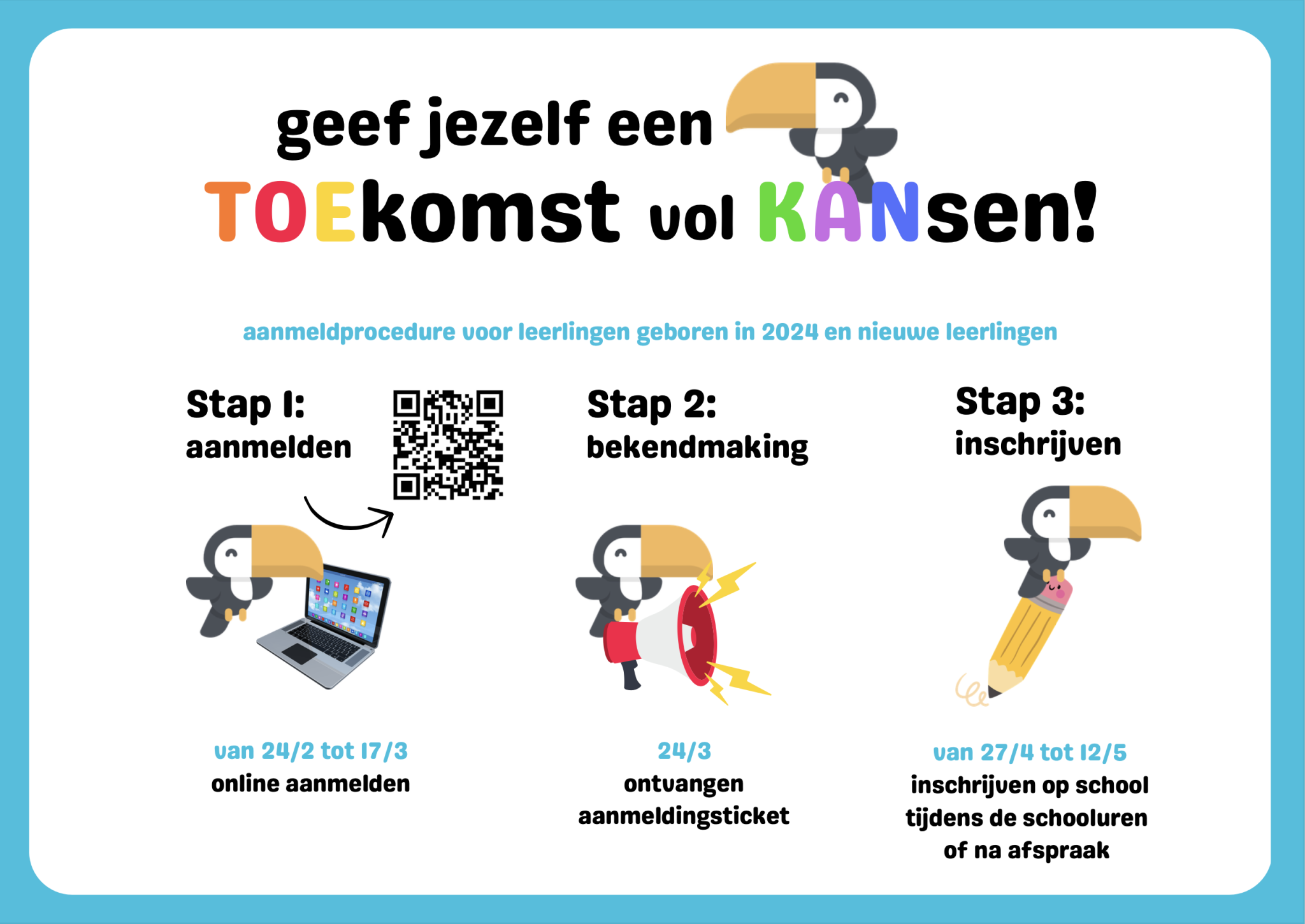De aanmeldingsperiode voor het volgende schooljaar loopt van 24 februari 2026 tot en met 17 maart 2026. Als je kind een aanmeldingsticket kreeg voor onze school, kan je je kind inschrijven tussen 27 april 2026 en 12 mei 2026.