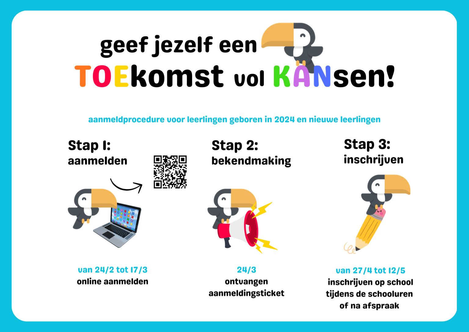 Elk Toekannertje (instappertje) is van harte welkom om voor de instapdatum te komen meespelen, samen met mama of papa of Dit maakt zeker de eerste schooldag wat minder spannend!